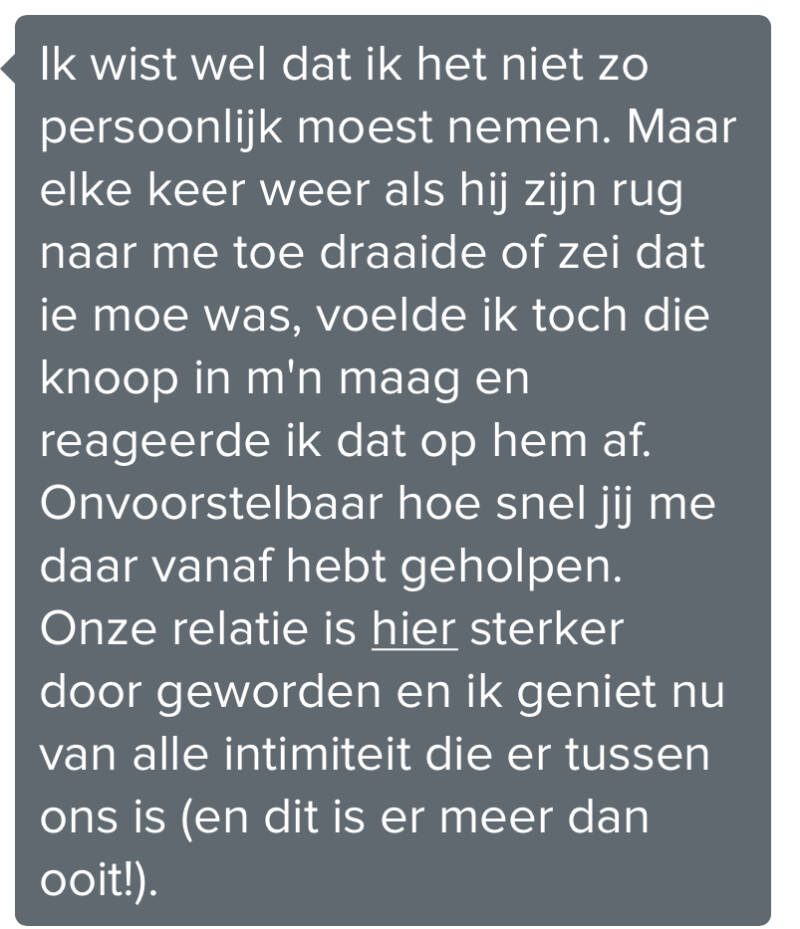 Wat hebben we dat lekker opgeruimd en nu heb ik inderdaad de relatie zoals ik die wilde, met dezelfde man en zonder gedoe."